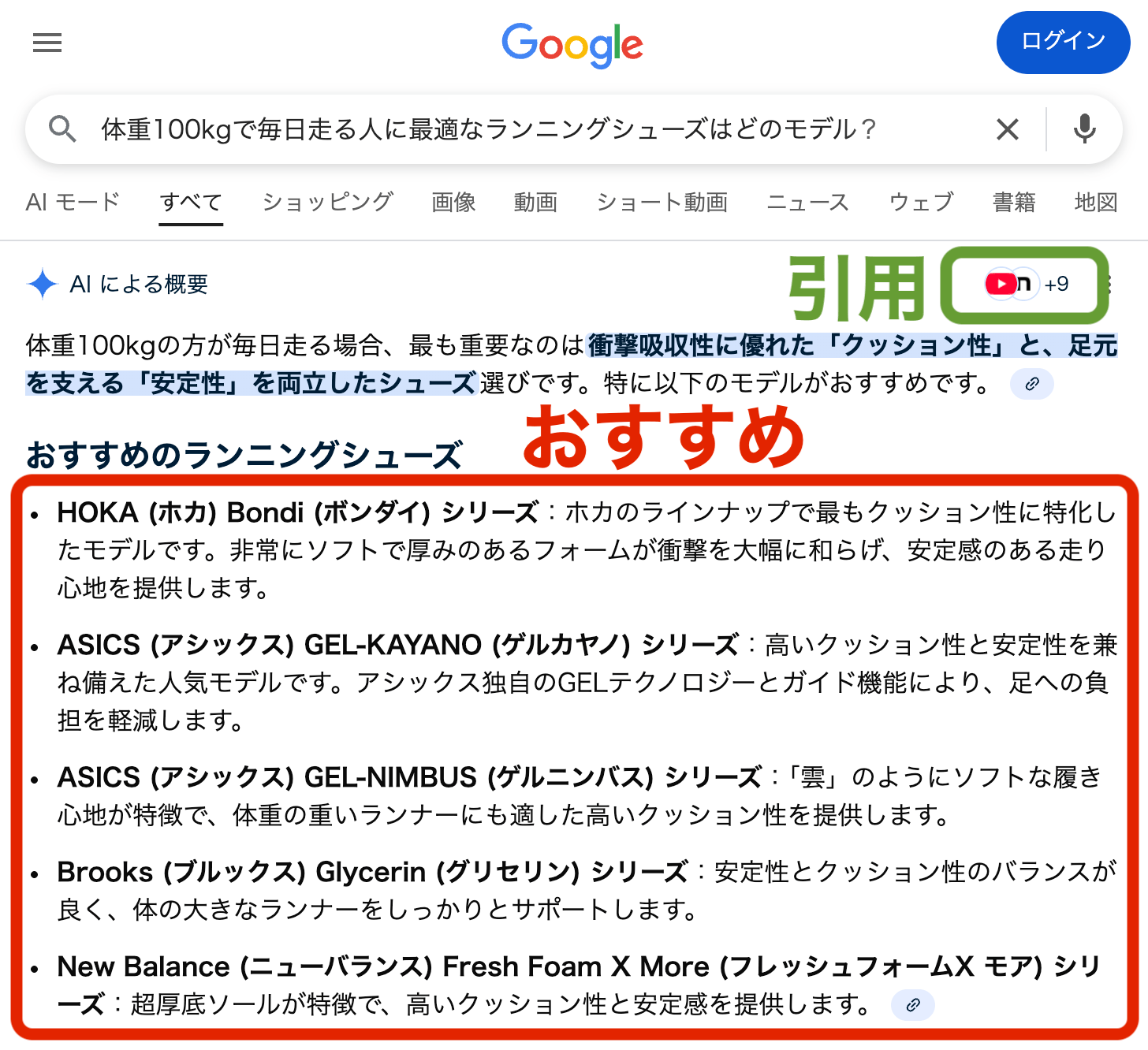 以下の画像は実際のAIによる概要のキャプチャです。緑色で示した部分が引用で、赤色で示した部分がおすすめです。自社そのものや、自社の製品や、自社のブランドが、AIが生成する回答の中で推奨の文脈で言及されることこそが、AI検索のSEOが重視するものです。