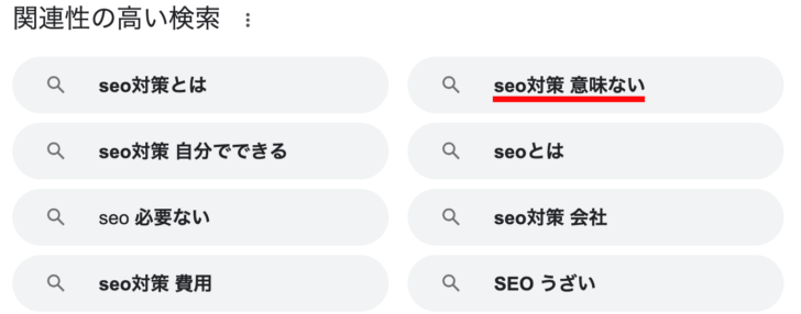 何らかの事情があってどうしても対策という言葉が使いたいのであれば、SEOは「検索エンジン最適化」の略ですから「検索エンジン対策」とでも言っておけばいい(これはこれでスパムっぽくて印象が悪いですが)のではないでしょうか。わざわざ混乱した用法である「SEO対策」を選択することは、コミュニケーションを無駄に複雑にします。
